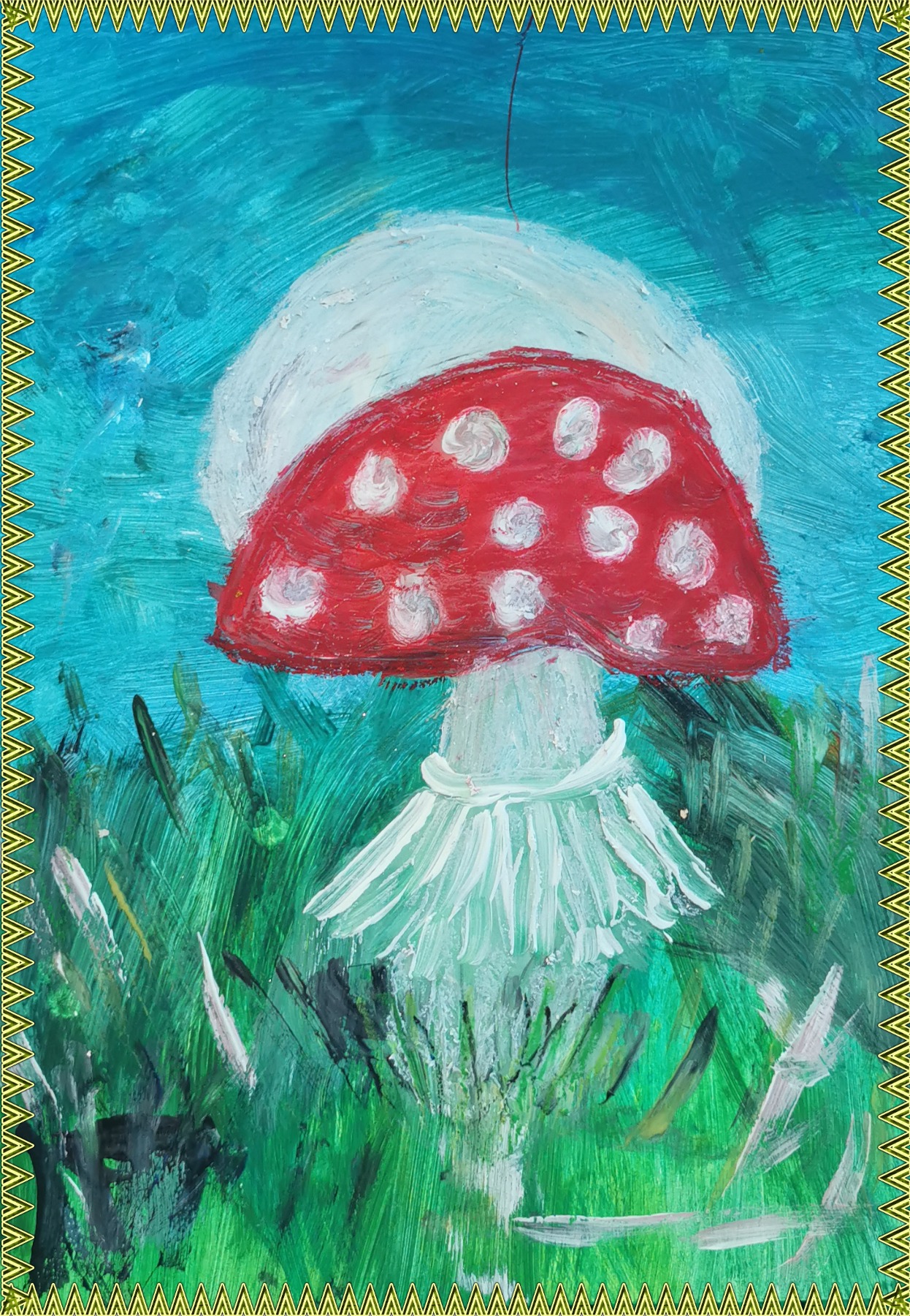 GRZYBY - KARTKA A3, FARBY AKRYLOWE, PĘDZEL, GĄBKA, PASTELA OLEJNA